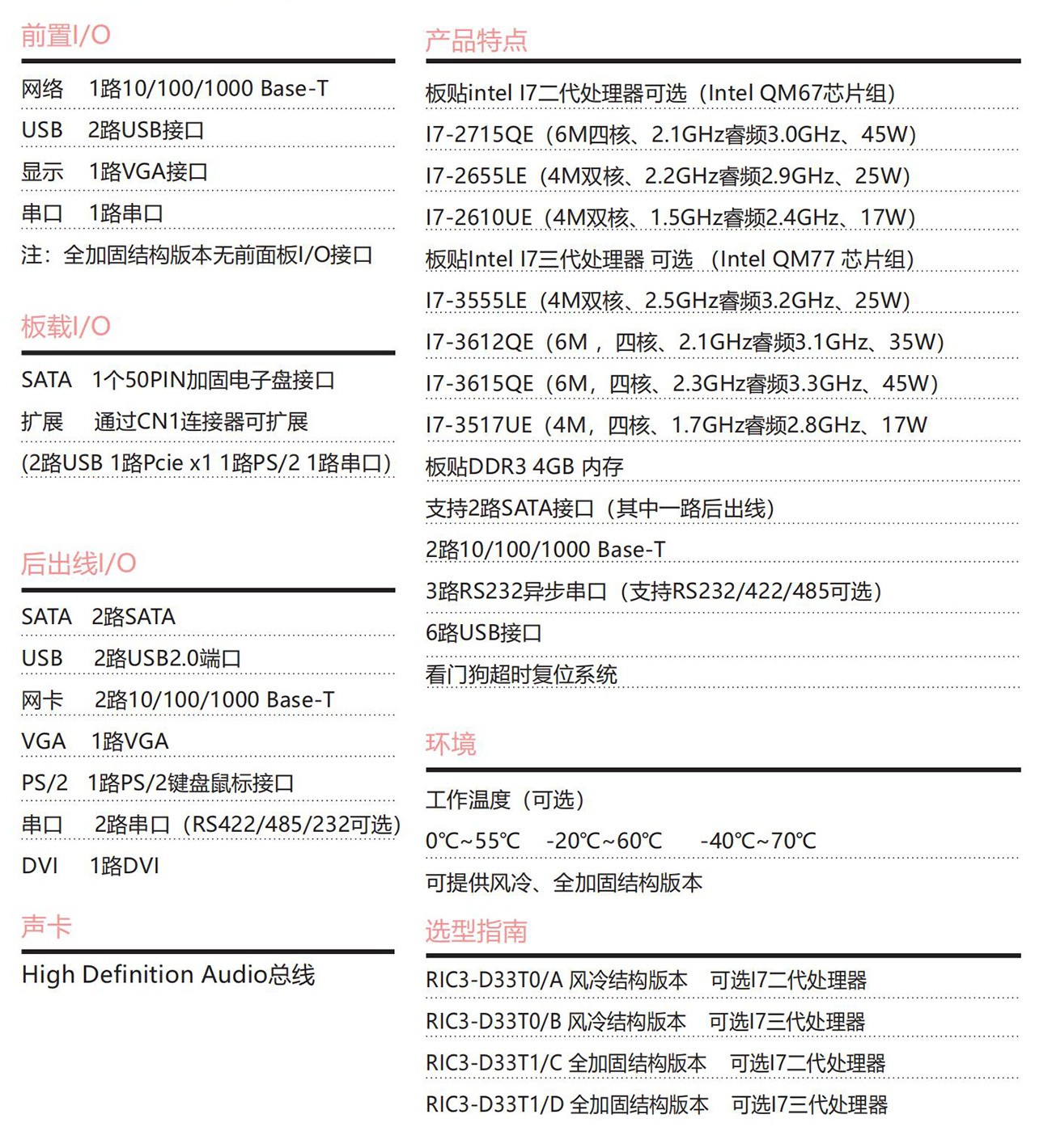 采 用Intel? I7二 代 , 三 代 處 理 器 設(shè) 計(jì) 方 案 ,CompactPCI 3U架 構(gòu) , 符 合 PICMG2.0 R3.0標(biāo)準(zhǔn)具備豐富的外圍接口;設(shè)計(jì)了高效的散熱系統(tǒng),可顯著提 高處理器的浮點(diǎn)運(yùn)算性能,以太網(wǎng)、PCIe TO PCI擴(kuò)展總線、滿足視頻采集與處 理等應(yīng)用對(duì)高速數(shù)據(jù)傳輸?shù)囊?。專為惡劣環(huán)境使用而設(shè)計(jì),滿足無人機(jī)、裝 甲車、水面艦艇等應(yīng)用需求。