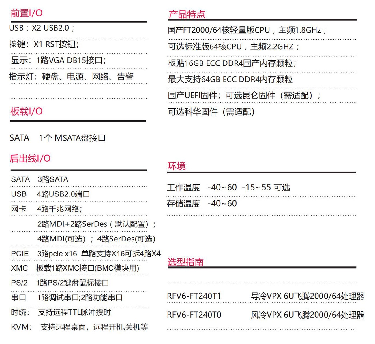采用國產(chǎn)飛騰處理器遵從 VITA65 規(guī)范支持貼裝不同規(guī)格 FT2000/64 CPU 最大支持64GB ECC DDR4內(nèi)存4路千兆 以太網(wǎng)絡支持TTL脈沖時統(tǒng)。具備豐富的外圍接口;設計了 高效的散熱系統(tǒng),可顯著提高處理器的浮點運算性能,以 太網(wǎng)、PCIe、支持高帶寬數(shù)據(jù)傳輸,滿足視頻采集與處理、雷達和聲吶等應用對高速數(shù)據(jù)傳輸?shù)囊?。滿足無人機、雷達、水面艦艇等軍工領(lǐng)域。