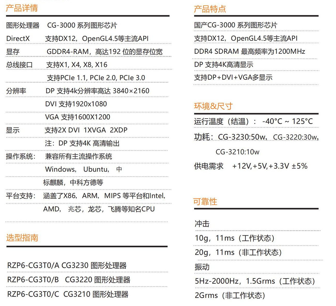 一款CPCI-E 6U 架構(gòu)獨(dú)立顯卡,采用CG-3000 系列芯片 圖形芯片, 是國(guó)內(nèi)領(lǐng)先的基于28 納米工藝的完全自主知識(shí)產(chǎn)權(quán)獨(dú)顯GPU 芯片,內(nèi)置自主 研發(fā)的新一代強(qiáng)大的圖像處理引擎,為AI 應(yīng)用做了特別優(yōu)化,完全滿(mǎn)足各 種日常顯示需求。具有多顯示輸出擁有很高的軟件系統(tǒng)兼容性,兼容所有 主流操作系統(tǒng),包括但不限于Windows, Ubuntu, 中標(biāo)麒麟,中科 方德等。硬件系統(tǒng)的支持也涵蓋了X86,ARM,MIPS 等平臺(tái)和Intel, AMD,兆芯,龍芯,飛騰等知名CPU 生產(chǎn)商。獨(dú)有的超低功耗設(shè)計(jì), 助力綠色辦公。所有的制程工藝和周邊器件全部可采用國(guó)內(nèi)供應(yīng)商, 確保完全自主可控,能夠應(yīng)對(duì)最復(fù)雜的并行應(yīng)用程序,比如地形繪